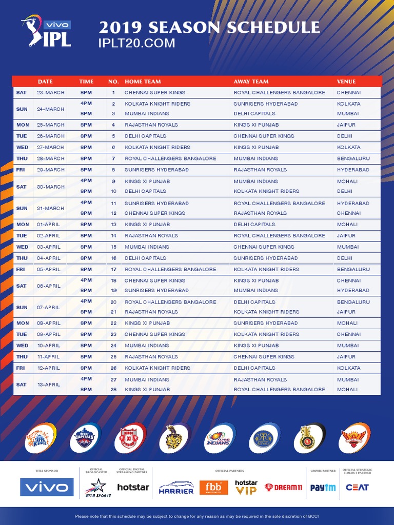 Pdf Ipl 2019 Schedule : Ipl 2019 schedule download in pdf, ipl 2019 live streaming, ipl season 12 match schedule pdf, vivo ipl live streaming online.